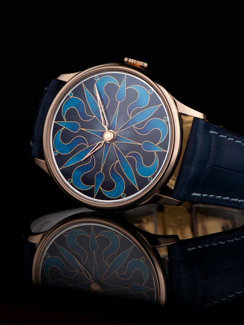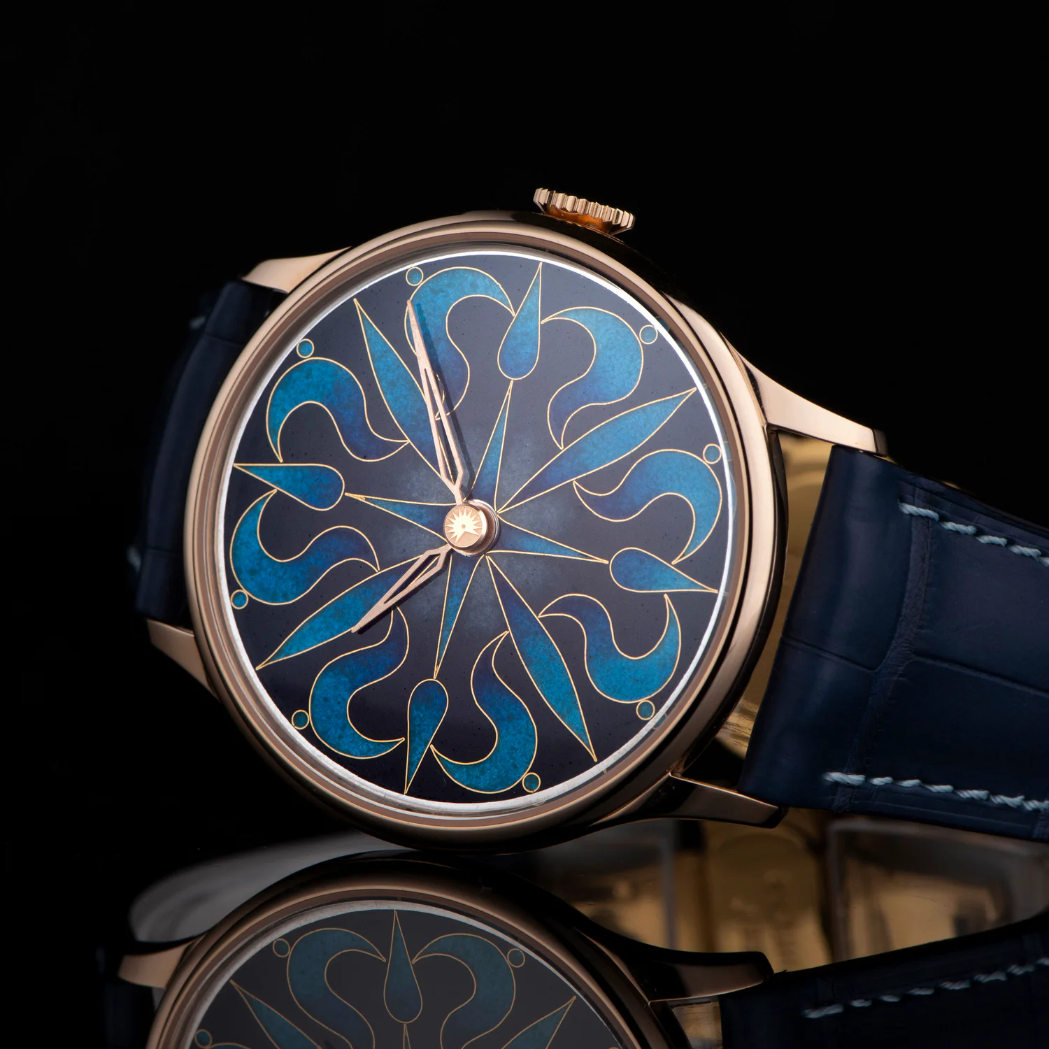 Labradorite is built around a dial in deep blues and shifting tones, echoing the natural colors of the labradorite stone. Fine gold lines shape a precise floral composition, giving structure to the soft, iridescent gradients beneath. The result is calm and slightly mysterious, a dial that changes with the light and reveals new nuances with every glance.